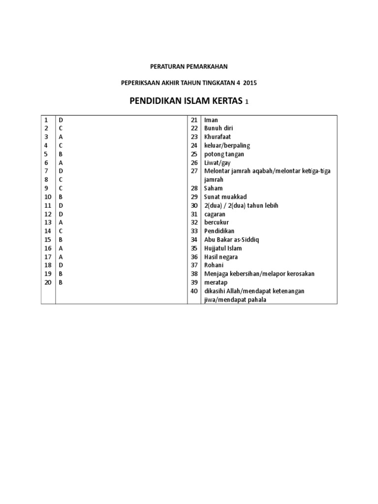 Skema Akhir Tahun Pendidikan Islam Kertas 1 Tingkatan 4 2015