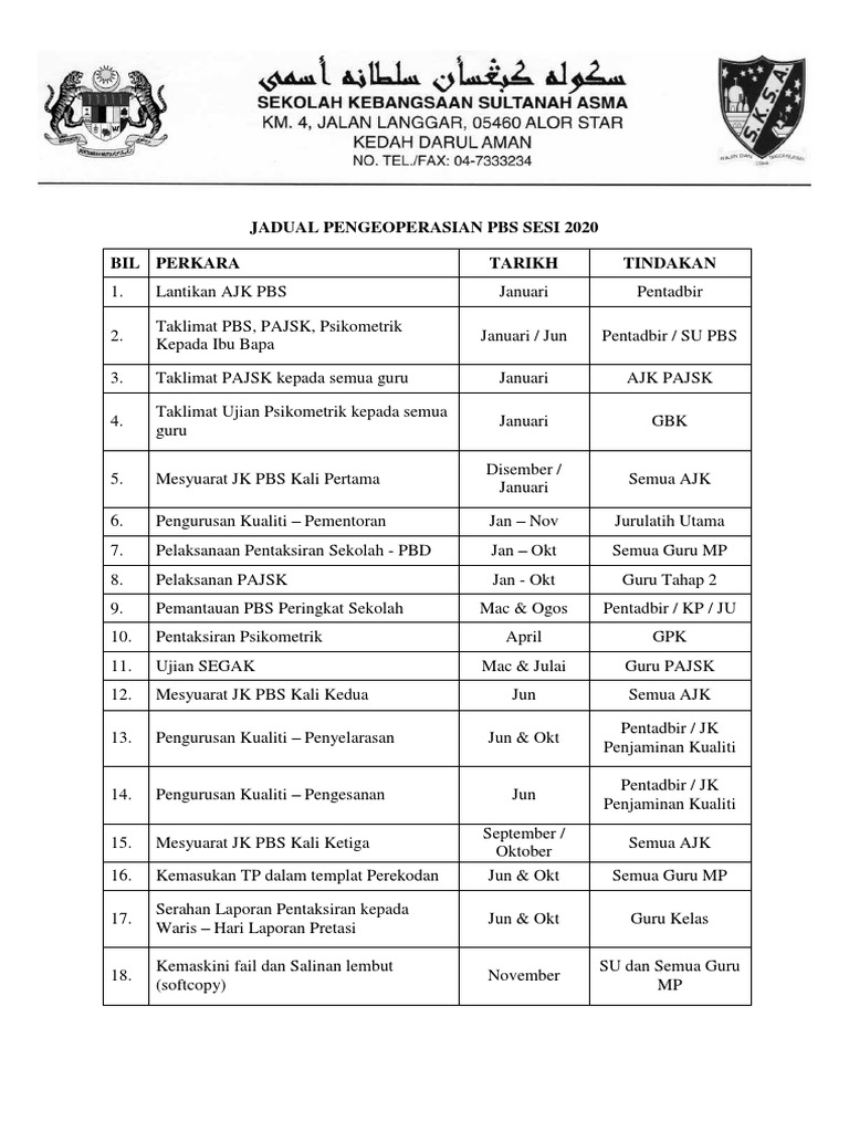 Jadual Pengeoperasian Pbs Sesi 2020 Pdf