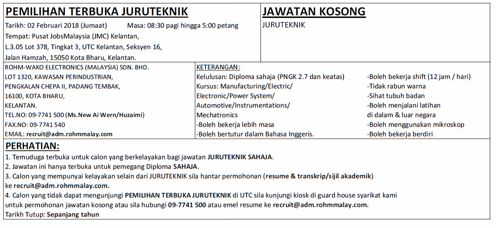 Jobfair Kptm Rohm Wako Electronic Malaysia Sdn Bhd Kerja Jawatan