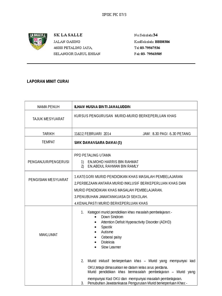 Laporan Minit Curai Kursus Pengurusan Murid Berkeperluan Khas