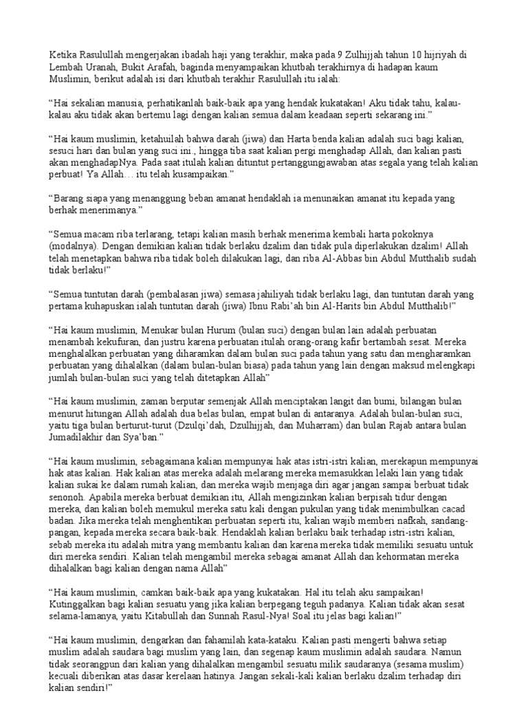Khutbah Terakhir Rasulullah Yang Disampaikan Pada 9 Zulhijjah Tahun 10 Hiriyah Di Lembah Uranah Gunung Arafah Pada Saat Melaksanakan Ibadah Haji Wad Pesan Islam
