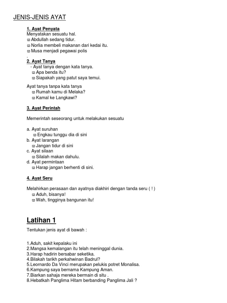 Latihan kendiri tatabahasa jenis jenis ayat 1 ayat penyata 2 ayat seruan 3. Oleh itu ayat perintah ialah ayat songsang kerana subjeknya di belakang dan predikatnya di depan 3 ada dua jenis ayat perintah iaitu ayat perintah aktif dan ayat perintah pasif 4 ayat perintah aktif terdiri daripada ayat penyata biasa dengan kata kerja transitif. Latihan jenis ayat draft.