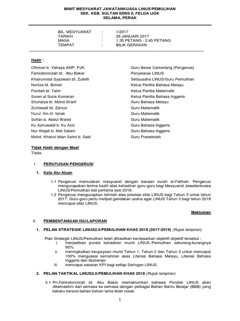 Minit Mesyuarat Jawatankuasa Linus 1 2018